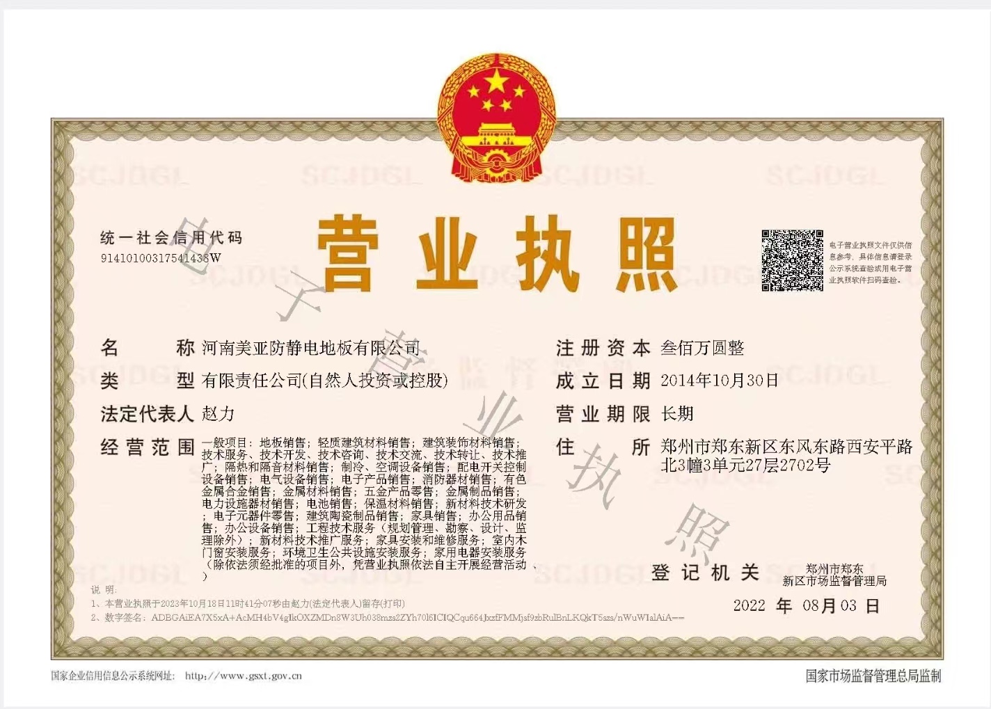 河南美亞防靜電地板有限公司營業執照
